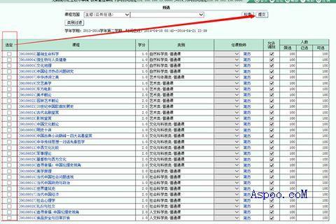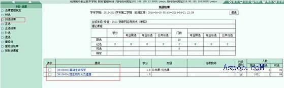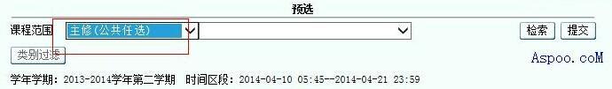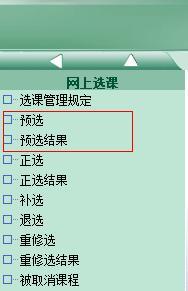 第三步:进入选课系统 点击“预选”,进入选课界面,如下图所示: 第四步:开始选课 在“课程范围”栏选择“主修(公共任选)”,点击“检索”,出现全部可选的课程信息,选择课程(每人限选一门)后,点击“提交”,完成选课。